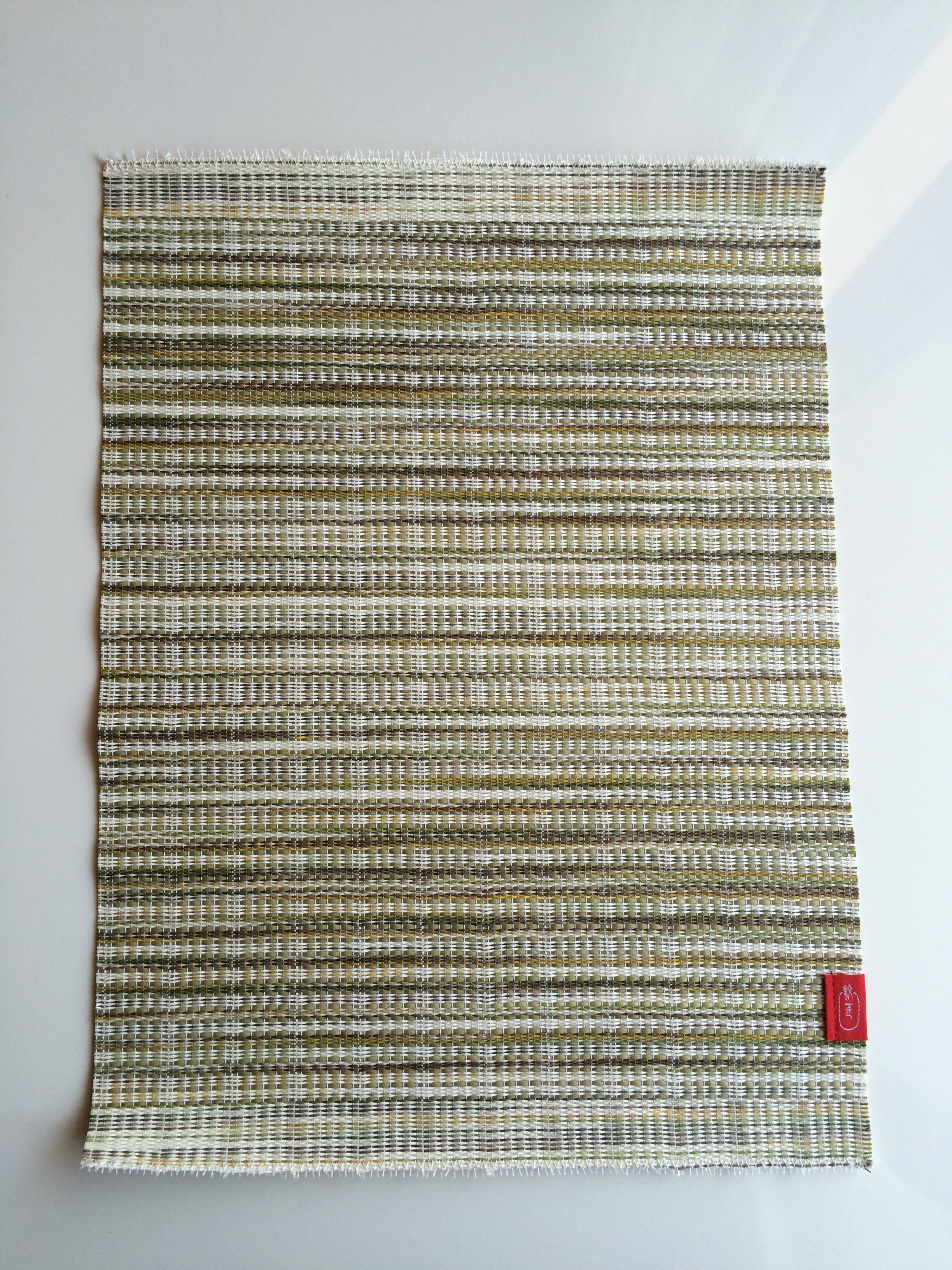 同色系のグラデーションに染めた和紙糸をい草と共に織り上げました。 同色系の濃淡が、華やぎを感じさせます。 色糸の間に織り込まれたありのままのい草。 い草の存在感と華やかな色味が、季節に合わせて器を引き立てます。
